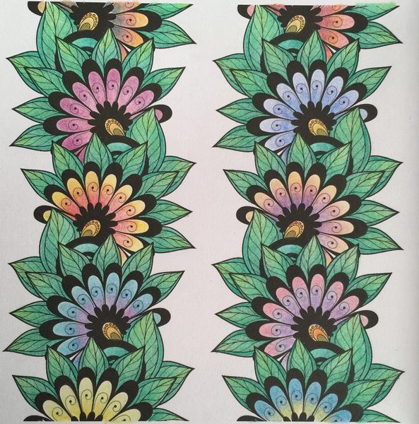Two columns of flowers with blended colors of flowers backed by green leaves