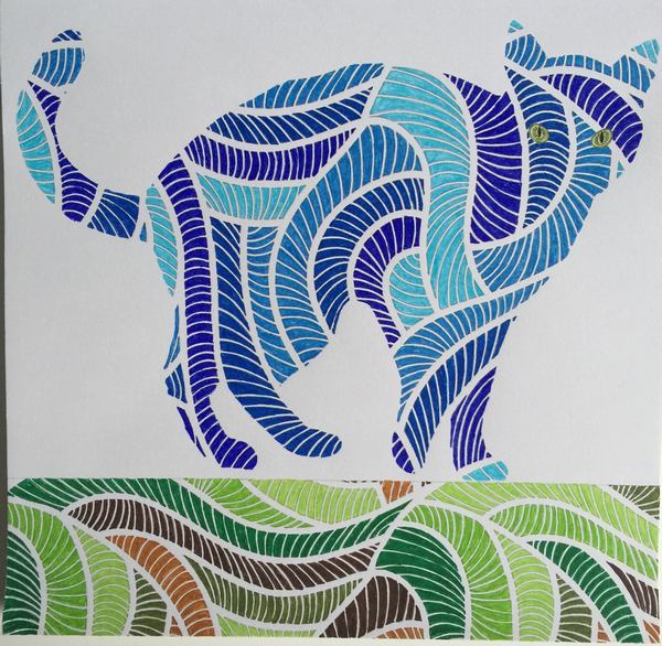 Fern Patterned Cat colored in shades of blue