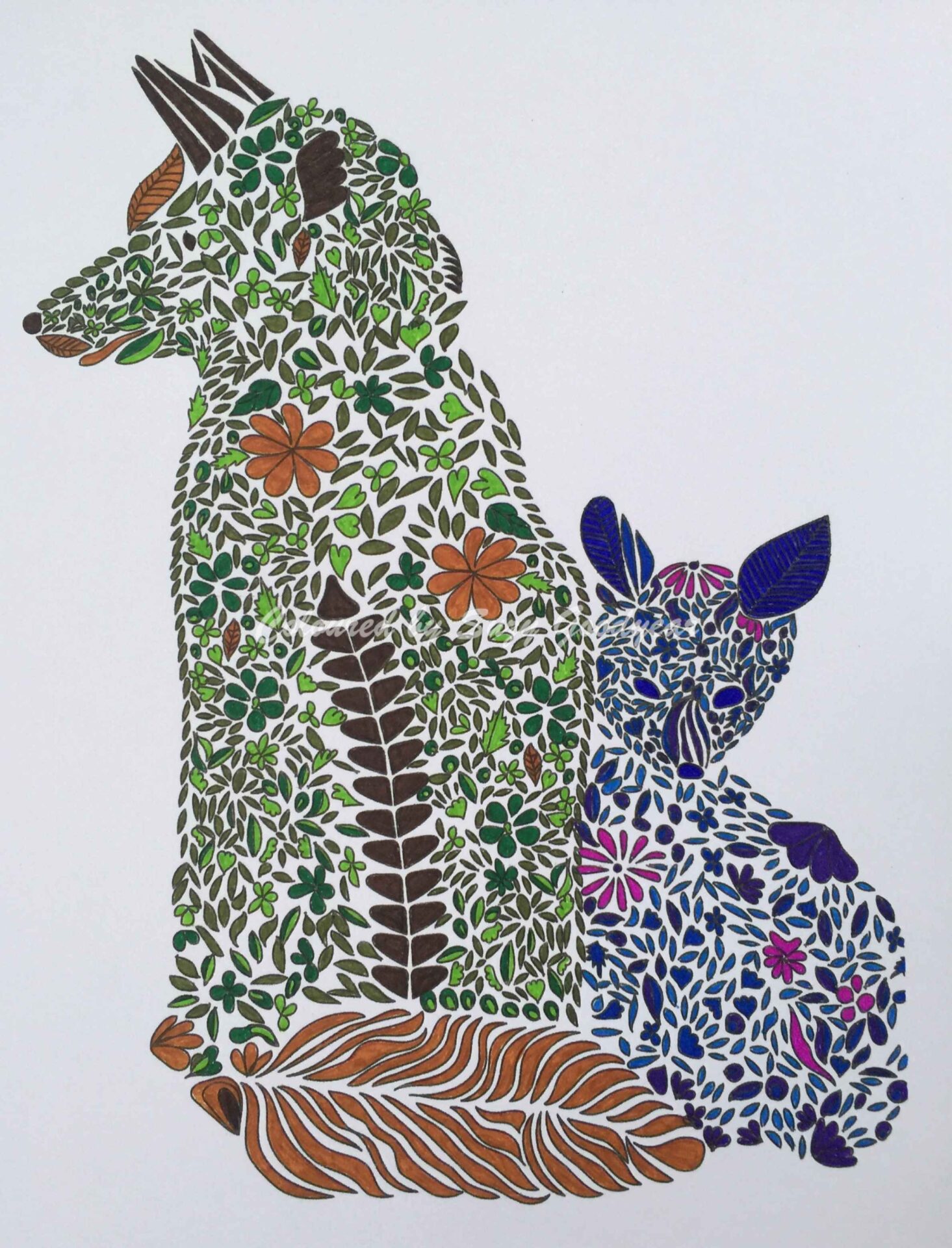 Multi shaded green and brown flower petal fox with blue and purple flower petal baby fox